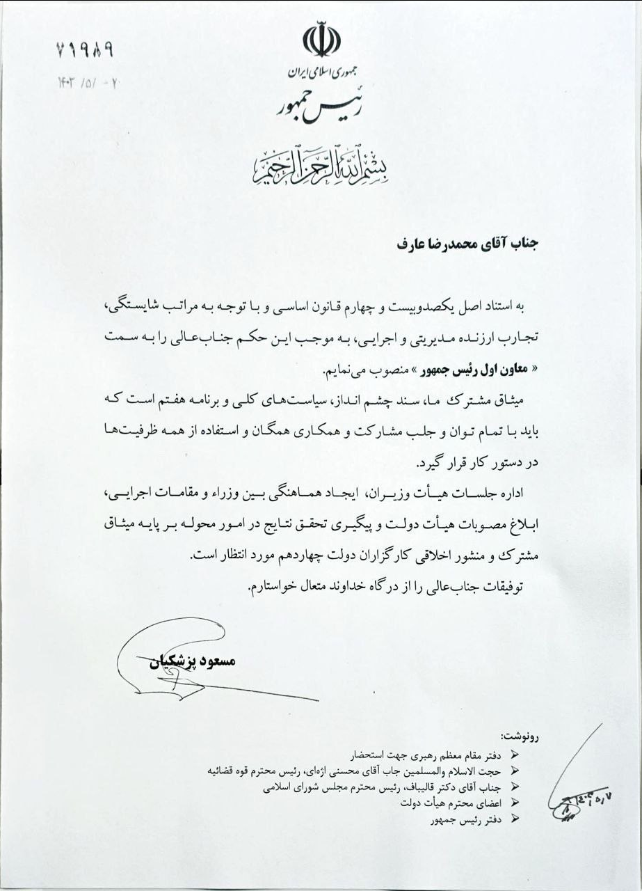 به استناد اصل ۱۲۴ قانون اساسی و با توجه به مراتب شایستگی، تجارب ارزنده مدیریتی و اجرایی، به موجب این حکم جنابعالی را به سمت «معاون اول رئیس جمهور» منصوب مینمایم.